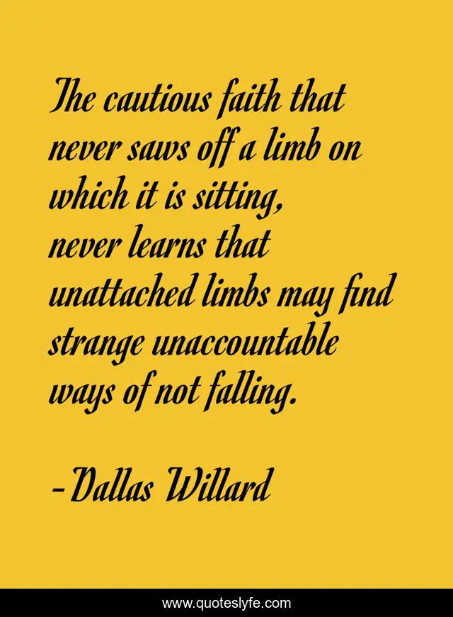 This page presents the quote "The cautious faith that never saws off a limb on which it is sitting, never learns that unattached limbs may find strange unaccountable ways of not falling.". Author of this quote is Dallas Willard. This quote is about faith, provision, god,.