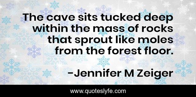 This page presents the quote "The cave sits tucked deep within the mass of rocks that sprout like moles from the forest floor.". Author of this quote is Jennifer M Zeiger. This quote is about fantasy, temple-of-night-and-wind, adventure, the-adventure,.