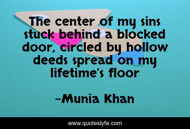 This page presents the quote "The center of my sins stuck behind a blocked door, circled by hollow deeds spread on my lifetime’s floor". Author of this quote is Munia Khan. This quote is about spiritual, door, regret, floor, sins, atonement, hollow, dark, stuck,.