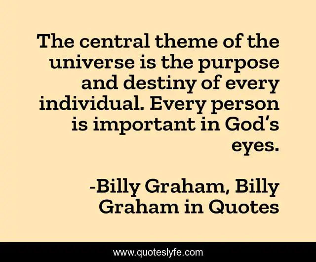 This page presents the quote "The central theme of the universe is the purpose and destiny of every individual. Every person is important in God’s eyes.". Author of this quote is Billy Graham, Billy Graham in Quotes. This quote is about billy-graham, people,.