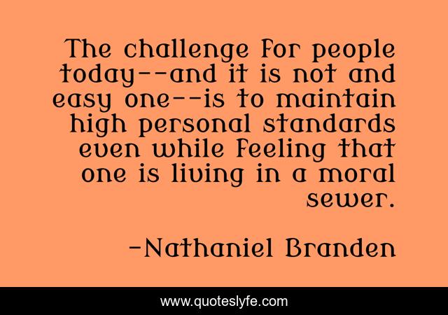 This page presents the quote "The challenge for people today--and it is not and easy one--is to maintain high personal standards even while feeling that one is living in a moral sewer.". Author of this quote is Nathaniel Branden. This quote is about psychology, self-knowledge, freedom, immorality, evil, society, virtue, self-esteem, morality,.