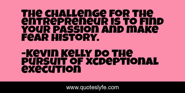 This page presents the quote "The challenge for the entrepreneur is to find your passion and make fear history.". Author of this quote is Kevin Kelly DO the pursuit of xcdeptional execution. This quote is about startups, leadership, kevin-kelly, motivation, entrepreneurship,.