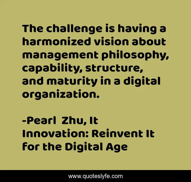 This page presents the quote "The challenge is having a harmonized vision about management philosophy, capability, structure, and maturity in a digital organization.". Author of this quote is Pearl Zhu, It Innovation: Reinvent It for the Digital Age. This quote is about it-innovation, digitalization, vision, innovation,.