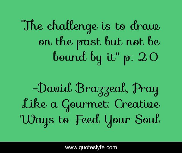 This page presents the quote "The challenge is to draw on the past but not be bound by it" p. 20". Author of this quote is David Brazzeal, Pray Like a Gourmet: Creative Ways to Feed Your Soul. This quote is about past, past-and-future, past-and-present,.
