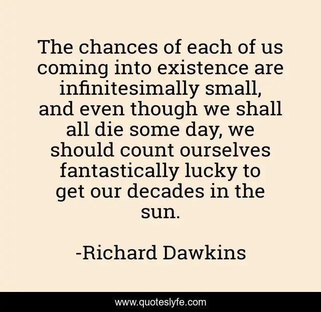 This page presents the quote "The chances of each of us coming into existence are infinitesimally small, and even though we shall all die some day, we should count ourselves fantastically lucky to get our decades in the sun.". Author of this quote is Richard Dawkins. This quote is about small, sun, day,.
