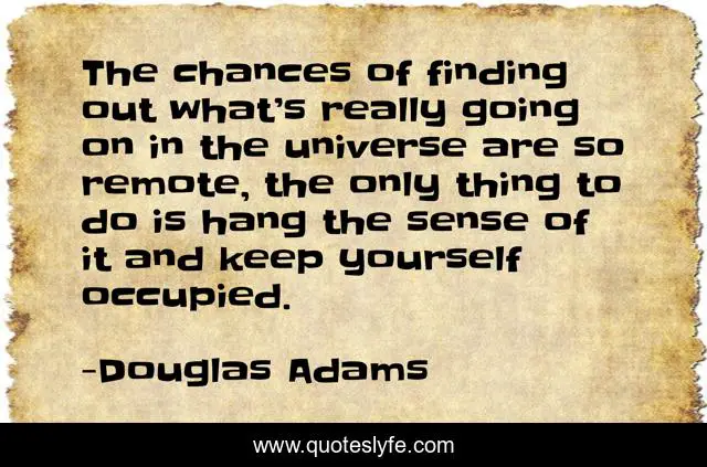 This page presents the quote "The chances of finding out what’s really going on in the universe are so remote, the only thing to do is hang the sense of it and keep yourself occupied.". Author of this quote is Douglas Adams. This quote is about universeing-occupied, universe, life, meaning-of-life,.