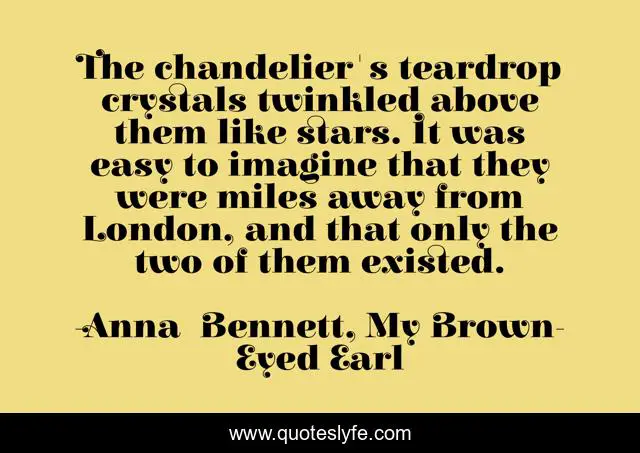 This page presents the quote "The chandelier's teardrop crystals twinkled above them like stars. It was easy to imagine that they were miles away from London, and that only the two of them existed.". Author of this quote is Anna Bennett, My Brown-Eyed Earl. This quote is about romance, my-brown-eyed-earl, romantic,.