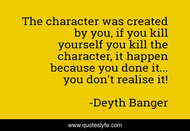 This page presents the quote "The character was created by you, if you kill yourself you kill the character, it happen because you done it... you don't realise it!". Author of this quote is Deyth Banger. This quote is about was, if, character, by, created,.