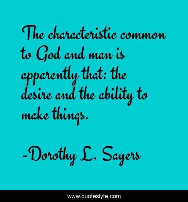 This page presents the quote "The characteristic common to God and man is apparently that: the desire and the ability to make things.". Author of this quote is Dorothy L. Sayers. This quote is about trinitarian, enthusiasm, creative-process, inspirational, theology,.