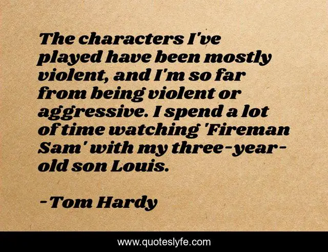 This page presents the quote "The characters I've played have been mostly violent, and I'm so far from being violent or aggressive. I spend a lot of time watching 'Fireman Sam' with my three-year-old son Louis.". Author of this quote is Tom Hardy. This quote is about being, spend, son,.