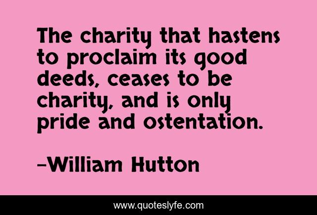 This page presents the quote "The charity that hastens to proclaim its good deeds, ceases to be charity, and is only pride and ostentation.". Author of this quote is William Hutton. This quote is about good, pride, charity,.