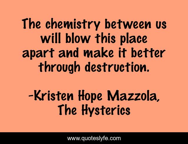 This page presents the quote "The chemistry between us will blow this place apart and make it better through destruction.". Author of this quote is Kristen Hope Mazzola, The Hysterics. This quote is about love, rock-star-romance, affection, romance-novels,.
