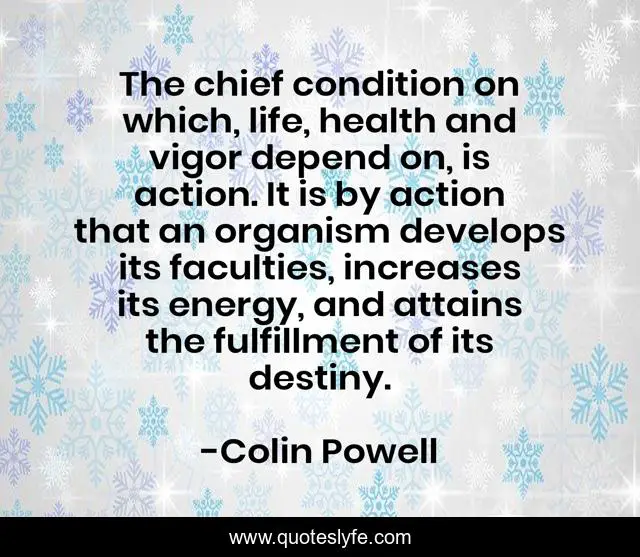 This page presents the quote "The chief condition on which, life, health and vigor depend on, is action. It is by action that an organism develops its faculties, increases its energy, and attains the fulfillment of its destiny.". Author of this quote is Colin Powell. This quote is about life, destiny, wisdom,.