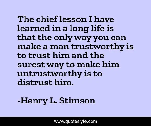 This page presents the quote "The chief lesson I have learned in a long life is that the only way you can make a man trustworthy is to trust him and the surest way to make him untrustworthy is to distrust him.". Author of this quote is Henry L. Stimson. This quote is about life, long, man,.