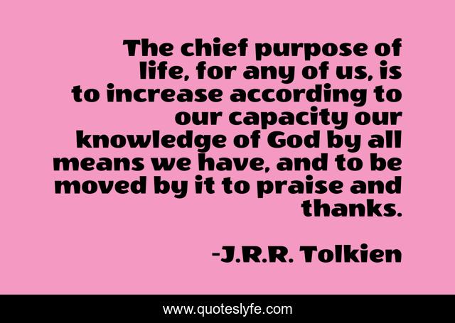 This page presents the quote "The chief purpose of life, for any of us, is to increase according to our capacity our knowledge of God by all means we have, and to be moved by it to praise and thanks.". Author of this quote is J.R.R. Tolkien. This quote is about praise, the-purpose-of-life, glory-of-god,.