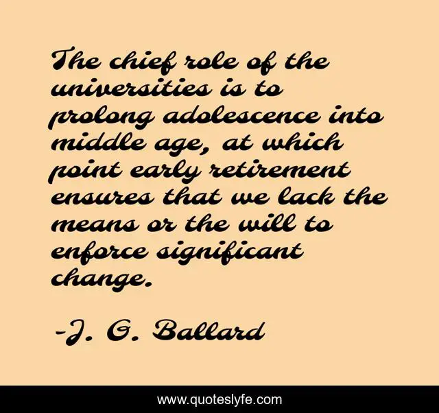 This page presents the quote "The chief role of the universities is to prolong adolescence into middle age, at which point early retirement ensures that we lack the means or the will to enforce significant change.". Author of this quote is J. G. Ballard. This quote is about retirement, change,.
