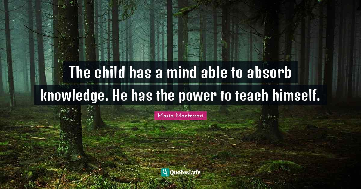 This page presents the quote "The child has a mind able to absorb knowledge. He has the power to teach himself.". Author of this quote is Maria Montessori. This quote is about knowledge, able, power, mind, teach, children,.