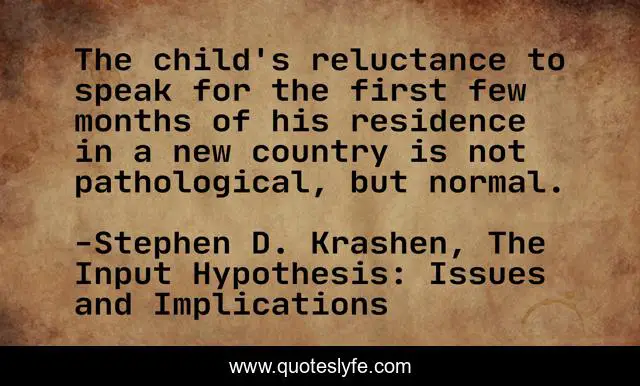 This page presents the quote "The child's reluctance to speak for the first few months of his residence in a new country is not pathological, but normal.". Author of this quote is Stephen D. Krashen, The Input Hypothesis: Issues and Implications. This quote is about language-acquisition, silence,.