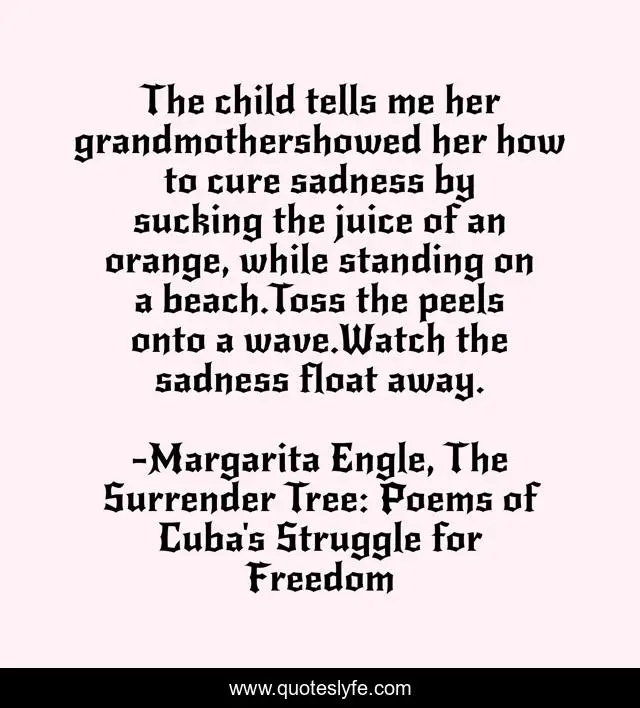 This page presents the quote "The child tells me her grandmothershowed her how to cure sadness by sucking the juice of an orange, while standing on a beach.Toss the peels onto a wave.Watch the sadness float away.". Author of this quote is Margarita Engle, The Surrender Tree: Poems of Cuba's Struggle for Freedom. This quote is about sadness, how-to-cure-sadness, sad, the-beach, waves,.