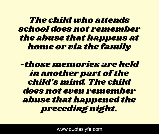 "those memories are held in another part of the child's mind. The child does not even remember abuse that happened the preceding night. Quotes." Quoteslyfe.com, 2025. Sun. 07 Dec. 2025. <https://www.quoteslyfe.com/quote/The-child-who-attends-school-does-not-257904>.