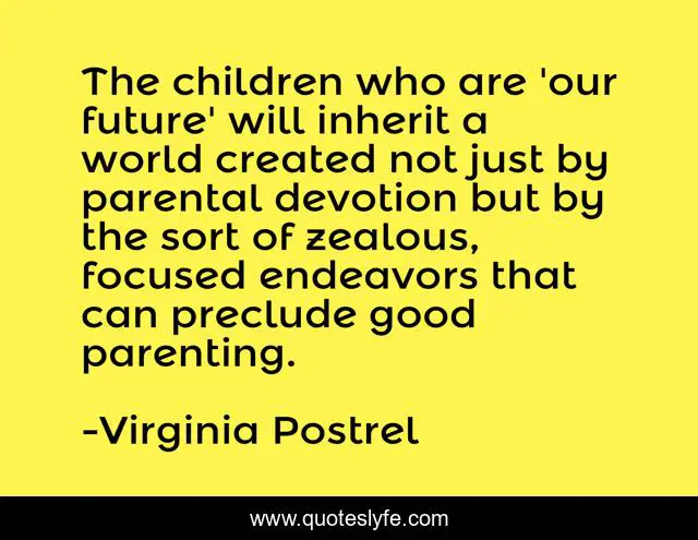 This page presents the quote "The children who are 'our future' will inherit a world created not just by parental devotion but by the sort of zealous, focused endeavors that can preclude good parenting.". Author of this quote is Virginia Postrel. This quote is about future, good, children,.
