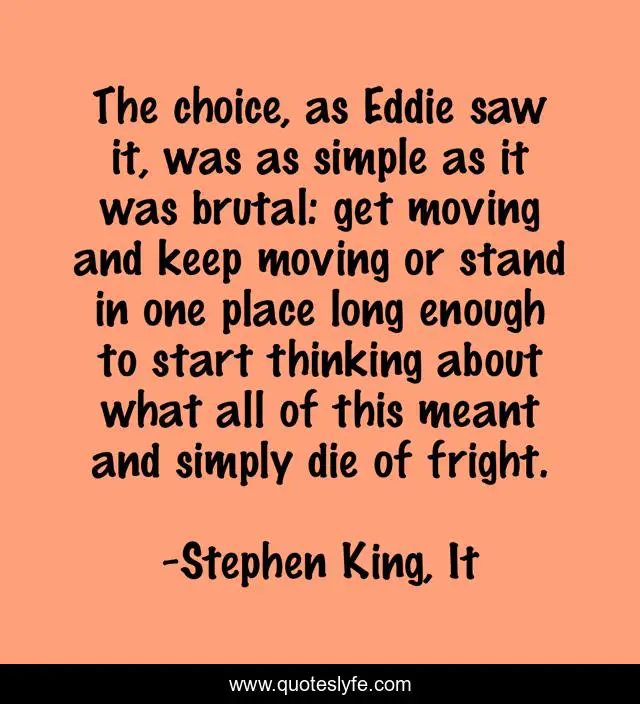This page presents the quote "The choice, as Eddie saw it, was as simple as it was brutal: get moving and keep moving or stand in one place long enough to start thinking about what all of this meant and simply die of fright.". Author of this quote is Stephen King, It. This quote is about die, death, fright, choice,.