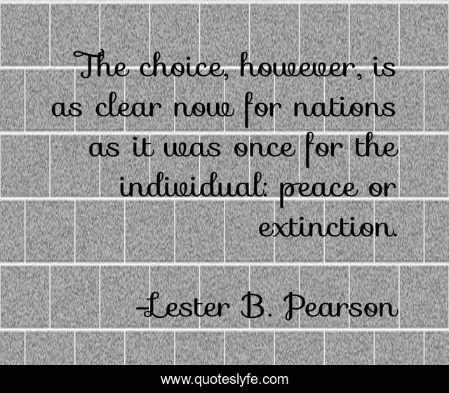 This page presents the quote "The choice, however, is as clear now for nations as it was once for the individual: peace or extinction.". Author of this quote is Lester B. Pearson. This quote is about choice, individual, nations,.