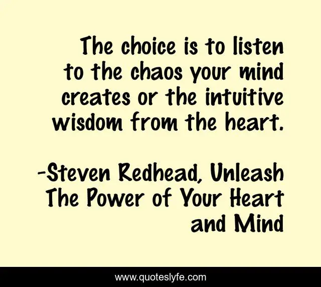 This page presents the quote "The choice is to listen to the chaos your mind creates or the intuitive wisdom from the heart.". Author of this quote is Steven Redhead, Unleash The Power of Your Heart and Mind. This quote is about heart, intuitive, mind, chaos, choice, creates, wisdom, listen,.