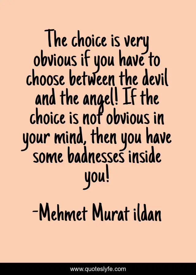 This page presents the quote "The choice is very obvious if you have to choose between the devil and the angel! If the choice is not obvious in your mind, then you have some badnesses inside you!". Author of this quote is Mehmet Murat ildan. .