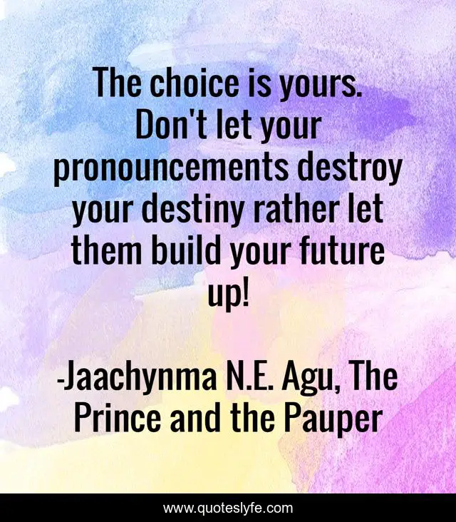 "Jaachynma N.E. Agu, The Prince and the Pauper Quotes." Quoteslyfe.com, 2025. Sun. 07 Dec. 2025. <https://www.quoteslyfe.com/quote/The-choice-is-yours-Don-t-let-28826>.