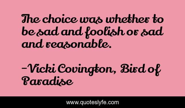 This page presents the quote "The choice was whether to be sad and foolish or sad and reasonable.". Author of this quote is Vicki Covington, Bird of Paradise. This quote is about choices, sad,.