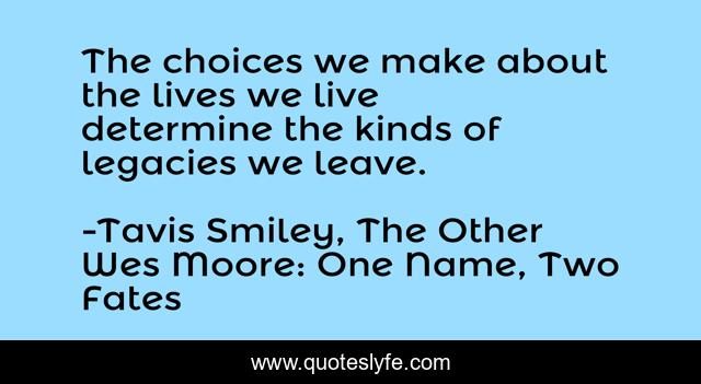 This page presents the quote "The choices we make about the lives we live determine the kinds of legacies we leave.". Author of this quote is Tavis Smiley, The Other Wes Moore: One Name, Two Fates. This quote is about life, legacy, choice, morality,.