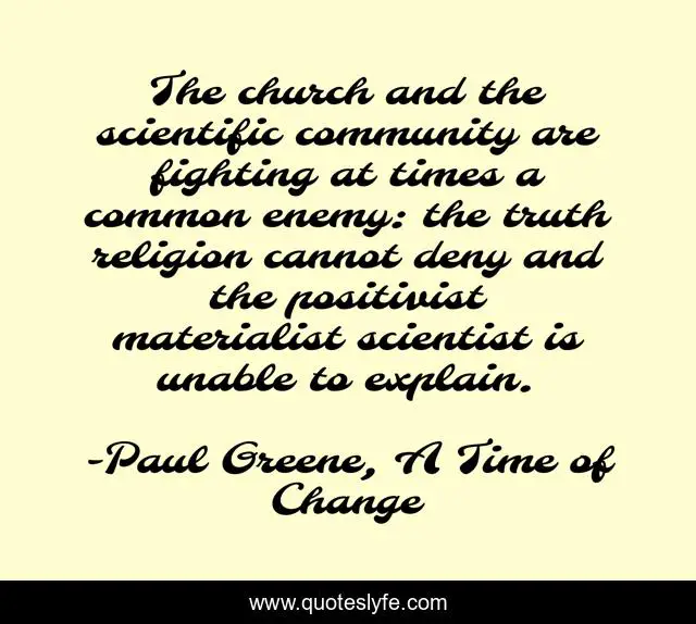 This page presents the quote "The church and the scientific community are fighting at times a common enemy: the truth religion cannot deny and the positivist materialist scientist is unable to explain.". Author of this quote is Paul Greene, A Time of Change. This quote is about science, philosophy, history, sociology, religion,.