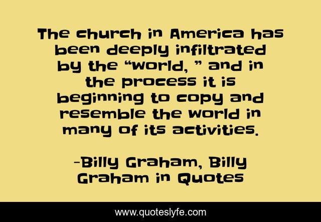 This page presents the quote "The church in America has been deeply infiltrated by the “world, ” and in the process it is beginning to copy and resemble the world in many of its activities.". Author of this quote is Billy Graham, Billy Graham in Quotes. This quote is about billy-graham, church,.