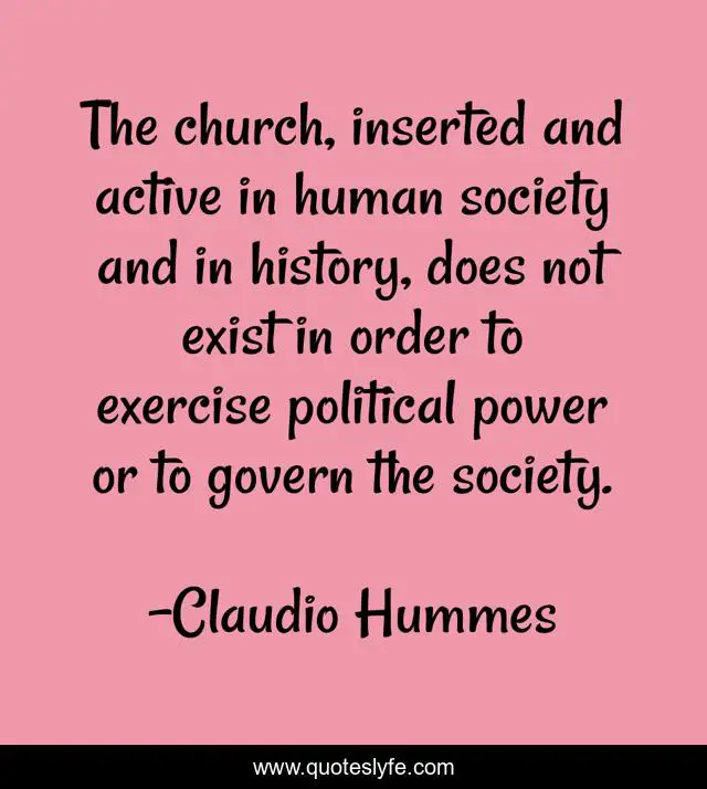 This page presents the quote "The church, inserted and active in human society and in history, does not exist in order to exercise political power or to govern the society.". Author of this quote is Claudio Hummes. This quote is about society, political, power,.