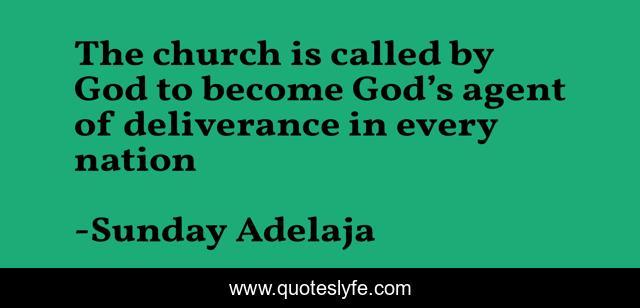 This page presents the quote "The church is called by God to become God’s agent of deliverance in every nation". Author of this quote is Sunday Adelaja. This quote is about god, agent, nation, deliverance, church, called,.