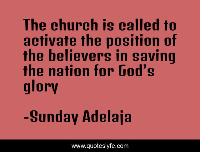 This page presents the quote "The church is called to activate the position of the believers in saving the nation for God’s glory". Author of this quote is Sunday Adelaja. This quote is about believers, position, church, god-s-glory, nation,.