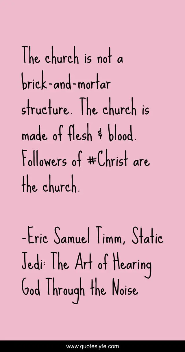 This page presents the quote "The church is not a brick-and-mortar structure. The church is made of flesh & blood. Followers of #Christ are the church.". Author of this quote is Eric Samuel Timm, Static Jedi: The Art of Hearing God Through the Noise. This quote is about faith, love, christ, god, static-jedi, father, jesus, eric-samuel-timm, hope,.