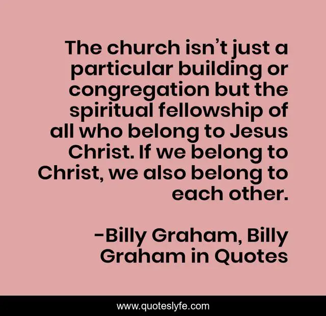 This page presents the quote "The church isn’t just a particular building or congregation but the spiritual fellowship of all who belong to Jesus Christ. If we belong to Christ, we also belong to each other.". Author of this quote is Billy Graham, Billy Graham in Quotes. This quote is about billy-graham, church,.