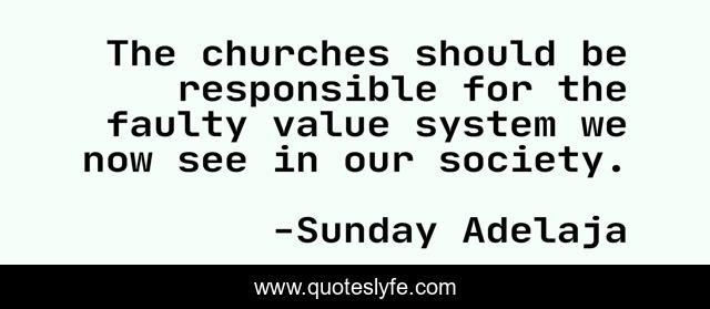 This page presents the quote "The churches should be responsible for the faulty value system we now see in our society.". Author of this quote is Sunday Adelaja. This quote is about churches, responsibilities, value-system, values, society,.