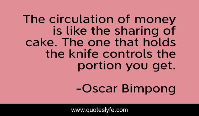 This page presents the quote "The circulation of money is like the sharing of cake. The one that holds the knife controls the portion you get.". Author of this quote is Oscar Bimpong. This quote is about cake, money, share, controls, knife,.