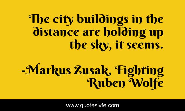 This page presents the quote "The city buildings in the distance are holding up the sky, it seems.". Author of this quote is Markus Zusak, Fighting Ruben Wolfe. This quote is about city, buildings, sky,.