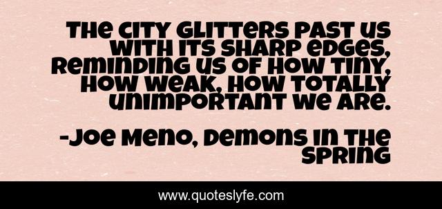 This page presents the quote "The city glitters past us with its sharp edges, reminding us of how tiny, how weak, how totally unimportant we are.". Author of this quote is Joe Meno, Demons in the Spring. .