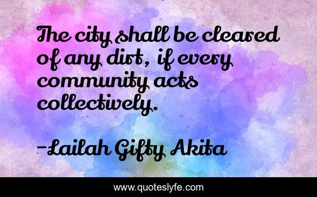 This page presents the quote "The city shall be cleared of any dirt, if every community acts collectively.". Author of this quote is Lailah Gifty Akita. This quote is about good, sanitation, community-service, community-outreach, environment, hygiene, clean-cities,.