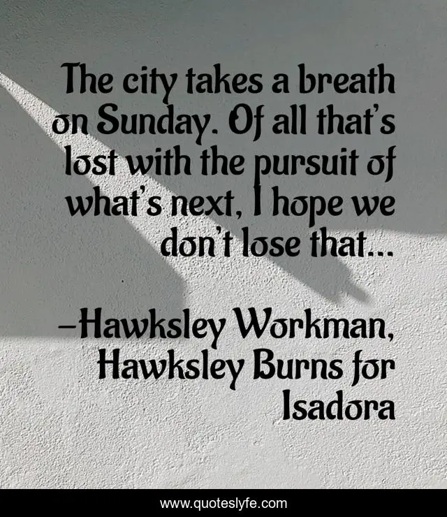"Hawksley Workman, Hawksley Burns for Isadora Quotes." Quoteslyfe.com, 2025. Mon. 08 Dec. 2025. <https://www.quoteslyfe.com/quote/The-city-takes-a-breath-on-Sunday-193617>.