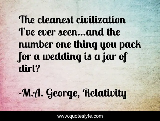 This page presents the quote "The cleanest civilization I’ve ever seen…and the number one thing you pack for a wedding is a jar of dirt?". Author of this quote is M.A. George, Relativity. This quote is about wedding-traditions, jar-of-dirt, paranormal-romance, sarcastic-humor,.