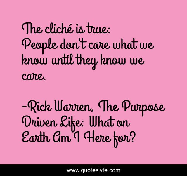 This page presents the quote "The cliché is true: People don't care what we know until they know we care.". Author of this quote is Rick Warren, The Purpose Driven Life: What on Earth Am I Here for?. .