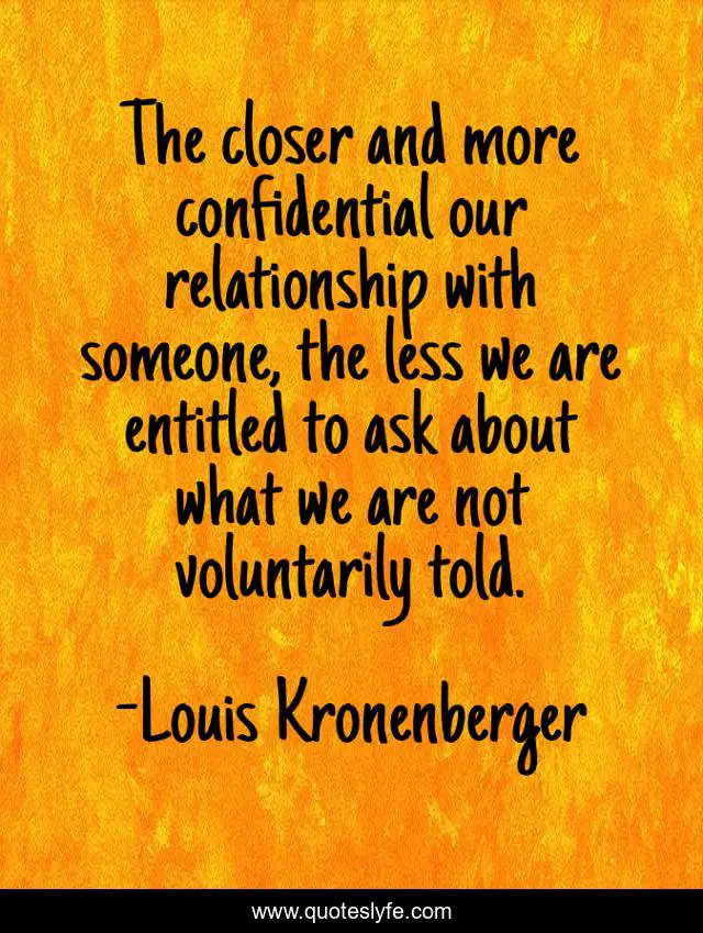 This page presents the quote "The closer and more confidential our relationship with someone, the less we are entitled to ask about what we are not voluntarily told.". Author of this quote is Louis Kronenberger. This quote is about relationships, confidence,.