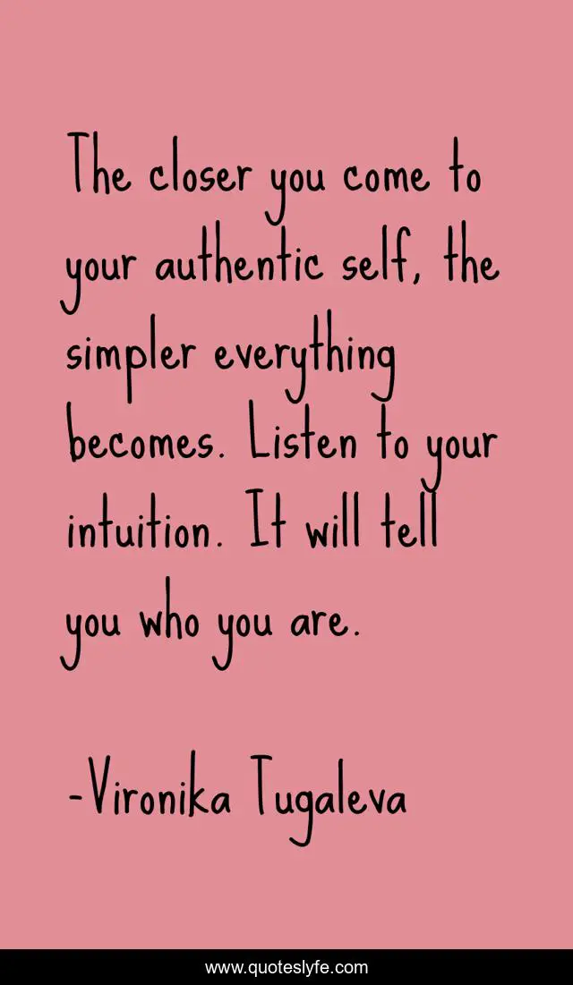This page presents the quote "The closer you come to your authentic self, the simpler everything becomes. Listen to your intuition. It will tell you who you are.". Author of this quote is Vironika Tugaleva. This quote is about intuition, self-awareness, be-yourself, self-discovery, self-love, who-you-are, authentic-self,.