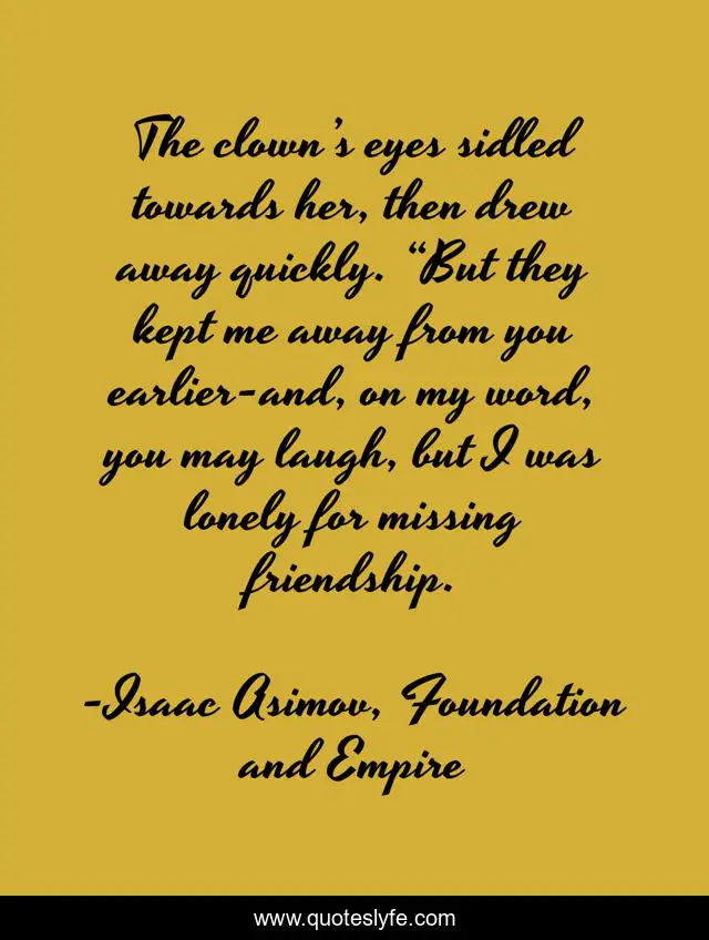 This page presents the quote "The clown’s eyes sidled towards her, then drew away quickly. “But they kept me away from you earlier-and, on my word, you may laugh, but I was lonely for missing friendship.". Author of this quote is Isaac Asimov, Foundation and Empire. This quote is about friendship, magnifico,.